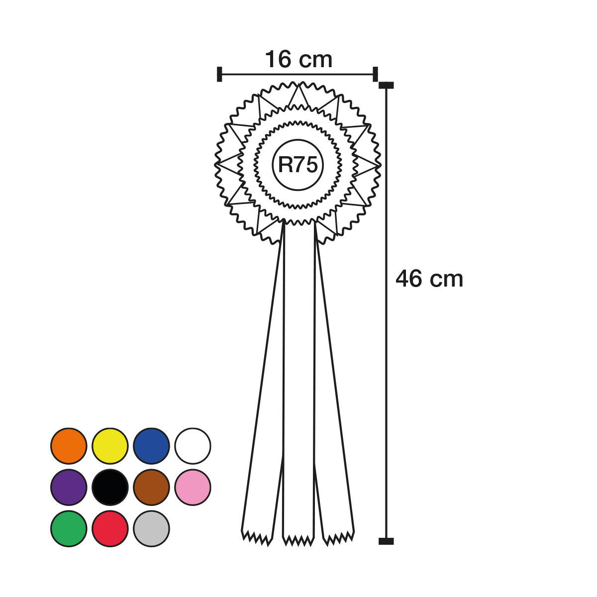 Imponerende og fargerik rosett med tre rosettringer, stjerne og tre bånd. Denne rosetten er en av våre største, målende hele 46 cm i lengde, og kan tilpasses med valgfrie farger på hver enkelt rosettring, stjerna og hvert enkelt bånd. Legg til egen tekst på midterste bånd og velg mellom fargeetikett eller sentermerke (Ø: 50 mm) midt i rosetten for å skape den perfekte premien for enhver anledning.