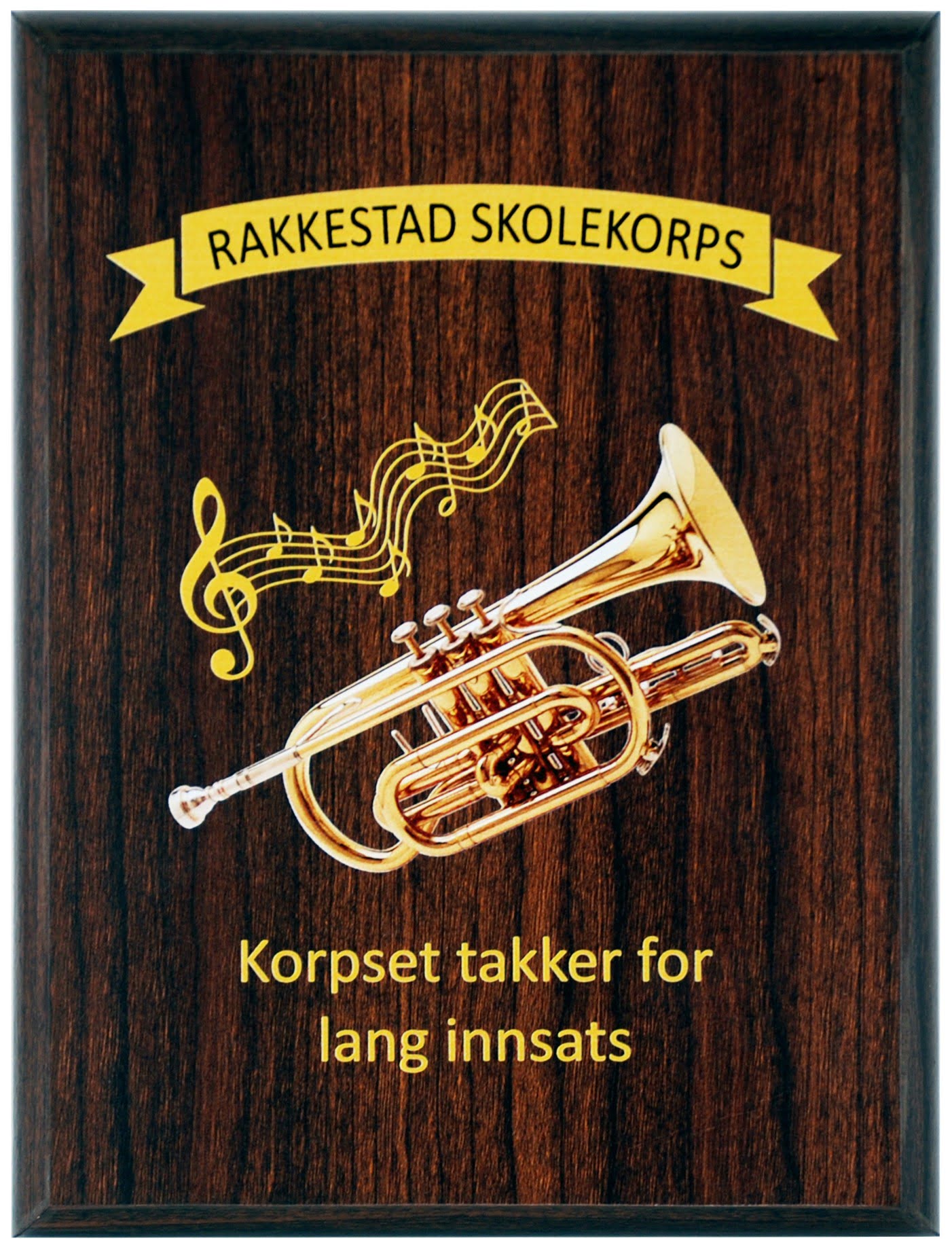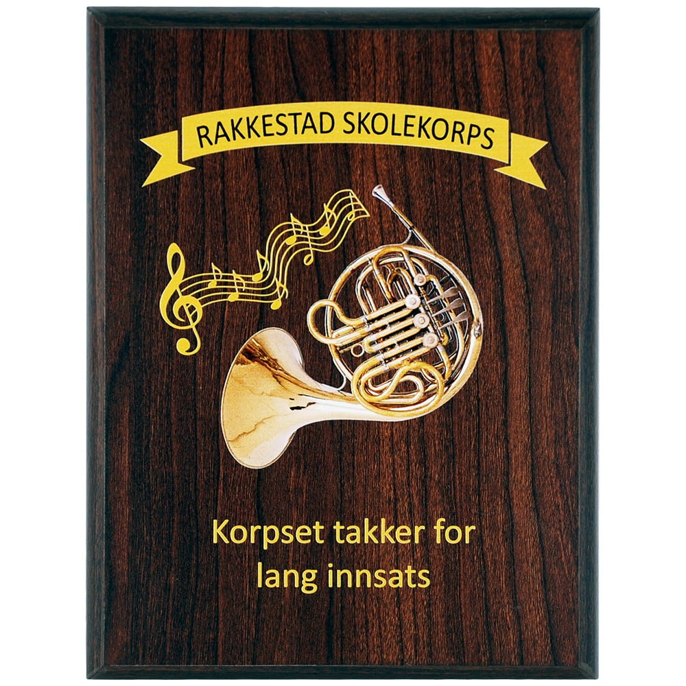 Treplaketten leveres med fullfarge digitaltrykk av valgfri logo og tekst.